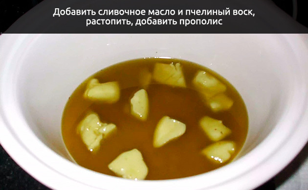 Когда жидкость станет тягучей и густой, добавляем в нее топленое сливочное масло, а также крошим пчелиный воск, все растапливаем и перемешиваем до однородной массы. Следующим кидаем прополис и продолжаем прогревать смесь. В результате на дне должен образоваться темный осадок. Это нормально, таким образом мы избавляемся от ненужных веществ. Продолжаем греть смесь до тех пор, пока она не загустеет или осадок не станет твердым.