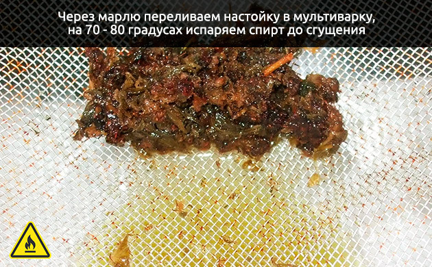 Для начала мы вливаем в большую емкость (кастрюлю, банку, миску) спирт и закидываем туда каннабис. Получившуюся смесь хорошенько перемешиваем и оставляем на несколько часов настояться, чтобы все активные вещества из конопли попали в жидкость. После этого снова перемешиваем смесь и через сито, выстеленное марлей, сложенной в несколько слоев, переливаем настойку в емкость мультиварки. Устанавливаем температуру нагрева 70-80 градусов и постепенно испаряем спирт до сгущения жидкости.