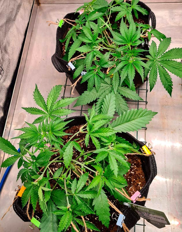На второй неделе растишки дважды получили подкормку с GHF Grow и один раз были политы чистой водой. Концентрацию удобрения повысил до 0,4 г/л. С середины недели начал гнуть основной стебель, чтобы простимулировать развитие боковых побегов. Кусты выглядят здоровыми, темп развития отличный. Никаких проблем, а значит, едем дальше.