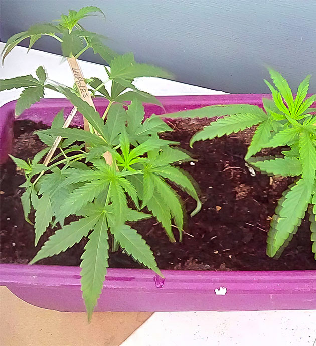 На второй неделе два черенка с самыми развитыми корнями были высажены в горшки объемом один литр. Укоренились они быстро, стояли под «куполами» из пластиковых бутылок. На 4-й день своей самостоятельной жизни я сделал им топпинг и снова накрыл. Саженцы довольно быстро пришли в себя, причем на одном из них сформировалось не два, а три новых стебля, эдакий Змей Горыныч. Ну что ж, так еще интересней. К концу недели их высота была плюс-минус 10 сантиметров. Лампа опущена достаточно близко к горшкам, на 25 сантиметров. Свет включен 20 часов в сутки.