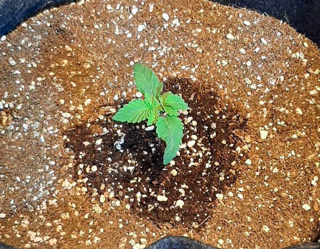 На третий день посадки, когда растишка уже набирала силы, к большому сожалению, из-за скачка электричества у меня перегорела ЭмПРА. И я остался только с одной лампой ДНаТ 400 Вт. Новая ЭмПРА шла до меня неделю, тем временем я попытался компенсировать недостаток света лампой LED 200 Вт. Полагаю, из-за этого рост растения замедлился. В дополнение к этому я начал кормить растение с первого дня (опрыскивал почву половинной дозой Plagron A+B cocos от рекомендованной производителем), и, скорее всего, это привело к искривлению листа.