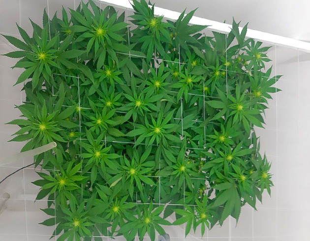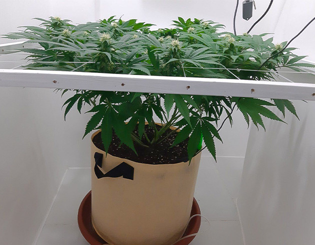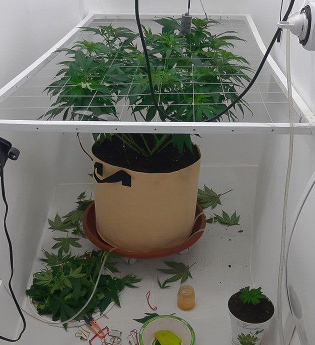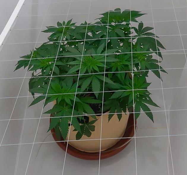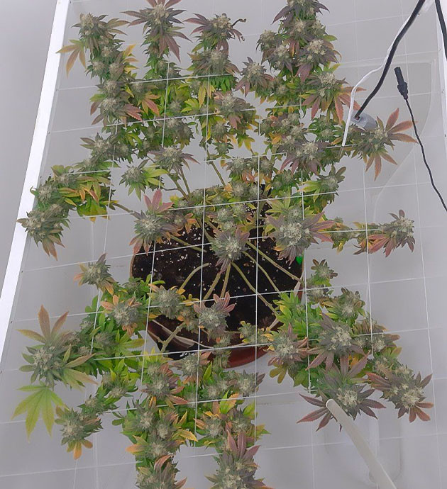 Поставил в бокс Муню и установил сетку. 37 дней от каски ей было в этот день. Над ней по-прежнему висит одна лампа Bestva. На данном этапе в боксе 59 % влажности и 23,4 °C. Сделал небольшую стрижку, убрал буквально несколько листков. На 40-й день был полив 3 литрами раствора на вегу, состав которого уже был выше, 100 % дозировки сделал и сверху добавил 3 мл «Биобизз БиоХэвэн» и 5 мл «Карболоад», рН раствора 6,2 и ppm 1250, в дренаж вытекло около 650 мл, в которых рН был 6,5 и ppm 1560. После этого еще немного постриг куст на нижних этажах.