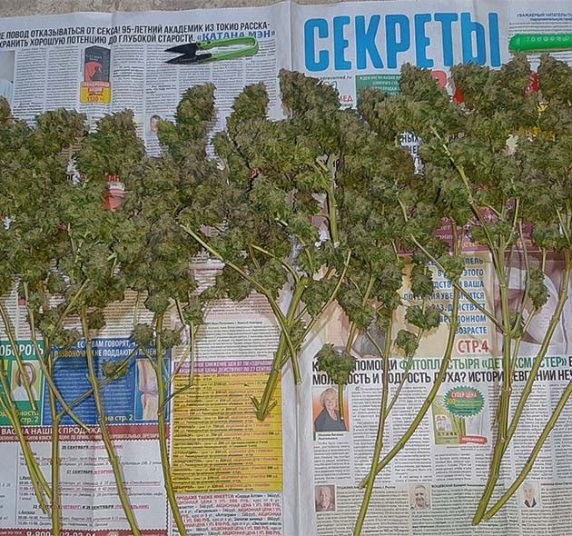 Листья не сберёг я, конечно, из-за этого куст выглядел не очень эстетично, но главное, что шишки наросли, а листья мне и не нужны вовсе. После маникюра разложил весь урожай на своей козырной газете для фотографирования.