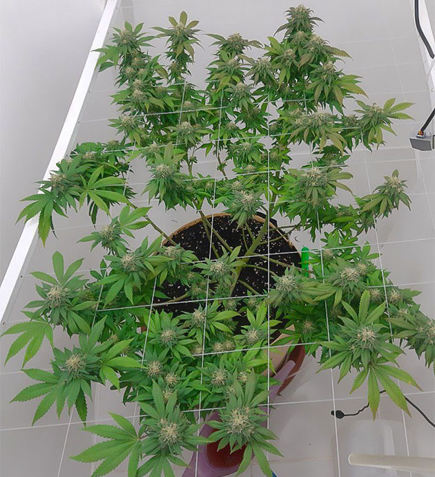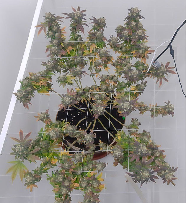 В начале недели немного поправил ветки под сеткой. На 58-й день сделал полив 3 литрами того же самого раствора на вегу в 100%-ной дозировке, что и в позапрошлый полив, рН 6,0 и ppm 1472. Спустя сутки опять немного подрастянул ветки. На 60-й день сделал большую дефолиацию. Фото до и после. После этого убрал все зажимы и резинки.