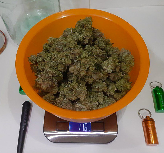 С харвеста я забрал самый мелкий попкорн домой сушиться. Шишки получились не очень плотными, на ветках провисели при температуре 20 °C и влажности 50 % около четырех суток, потом я убавил влажность до 40 % и по прошествии ещё около 2 суток получил хорошо просохшую ганджу. Высохшие шишки заняли примерно 2,5 литра в трехлитровой банке. Мой честный вес получился весьма скромным – 116 грамм.