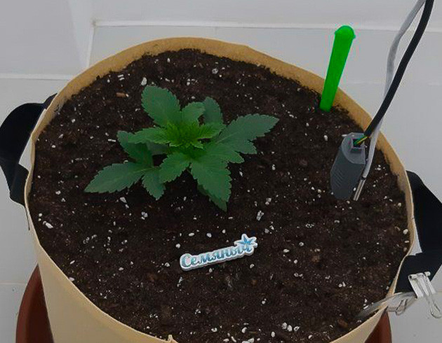 Сбрызнул сверху субстрат из пульверизатора простой чистой водой. Моя чистая вода имеет около 80 ppm и 7,5 рН, для сбрызгивания я рН понижаю до 5,8-6,0. Обрезок бутылки для парникового эффекта изнутри тоже побрызгал и, как говорил, повесил 1 «Беству» со включённым режимом «Вега». Датчики, висящие на уровне верха горшка, показывали температуру 23,6 °C и влажность 64 %.