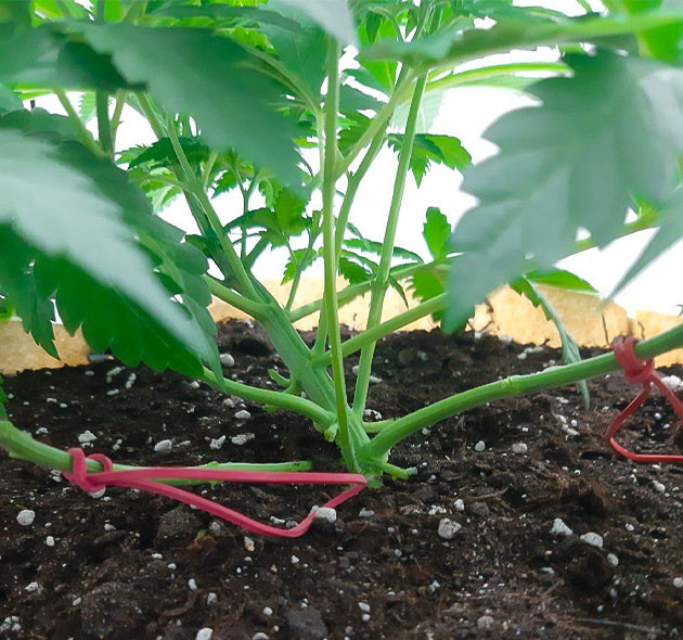 Спустя сутки Муня прогнула центральный стебель и типа подняла голову. Я передвинул зажим с резинкой по краю гроубэга ближе к ручке, тем самым увеличив силу натяжения, соответственно, растиха нагнулась ещё чуть ниже. На 16-й день пониже нагнул растиху и веточки нижние как бы вытащил на свет, подзаправив под них большие (относительно) листья, чтобы к свету тянулись и росли ветки. Пару дней спустя переставил резинку на этаж выше по централке, подогнул на грани фола. Резинку на зажиме сложил вдвое, ещё уменьшив её длину. Листья под отрастающие веточки заправил да сверху субстрат взрыхлил немного. К концу третьей недели нижние ветви прилично вытянулись, и я поставил зажимы с резинками для них. Полив сделал уже 2 литрами, состав добавляемых удобрений не менял, лишь пропорционально увеличил их количество: по 4 мл «Биобизз БиоХэвэн» и «Вуду Джуйс» + 2 мл «Карболоад». Получилось рН 6,2 и ppm 187.