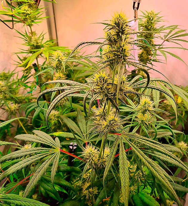 Многие желтые листья перекрасились в розоватый оттенок, а на большинстве соцветий трихомы стали янтарными. В скором времени приступлю к промывке.