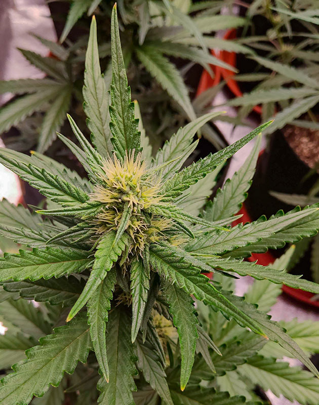 На шестой неделе на одной из растишек появились признаки то ли ожога, то ли дефицита. Я сильно не заморачивался, так как в целом она выглядит хорошо, пострадали только несколько листьев. На всех кустах удалил значительную часть лопухов, они уже не нужны для нормального развития и набора массы шишек. Бошки, вообще, выглядят так, что хоть сейчас под нож пускай. Было бы здорово растить такой автоцвет, который созревает за 6 недель, не так ли? Но пока такое можно встретить только в описании некоторых сортов, на практике такого я не встречал (вы, думаю, тоже). Ну а что до Purple Punch OG XL Auto, то их рост устаканился в пределах 70 сантиметров, с увеличением шишек появился достаточно резкий запах, но из-за того, что в палатке есть другие сорта, что-то конкретное сказать не могу. На этой неделе растишки получали уже по три литра за раз, теперь была одна подкормка и два пролива чистой водой. Состав компота такой же, как и до этого, ничего не менял.