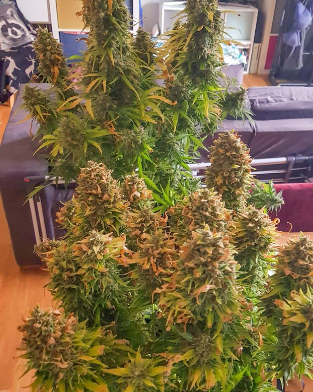 Это был мой первый опыт выращивания конопли, и он не обошелся без ошибок. Я случайно сломал стебель одного из кустов, неправильно рассчитывал удобрения и, возможно, затянул с харвестом. Но в итоге культивация прошла хорошо и относительно легко, благодаря чему я получил замечательный урожай, которым буду наслаждаться еще очень долго. Scout Cookies Auto от «Семяныча» – отличный сорт, рекомендую.