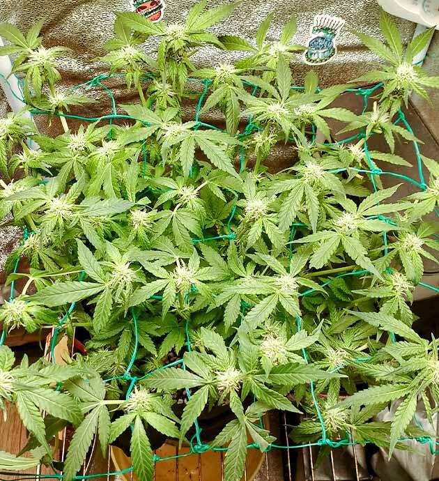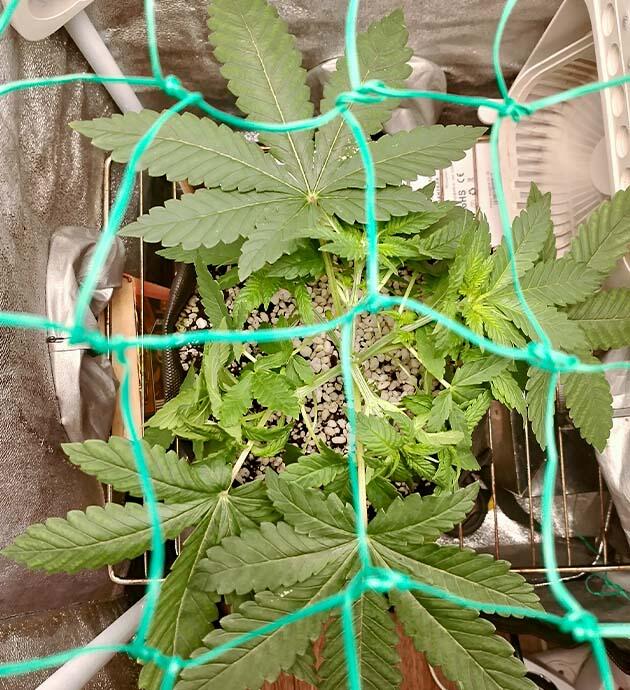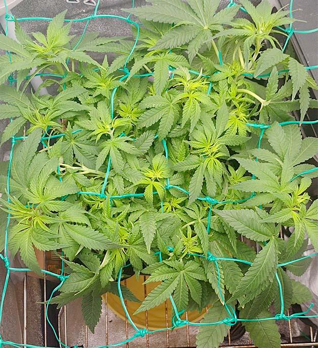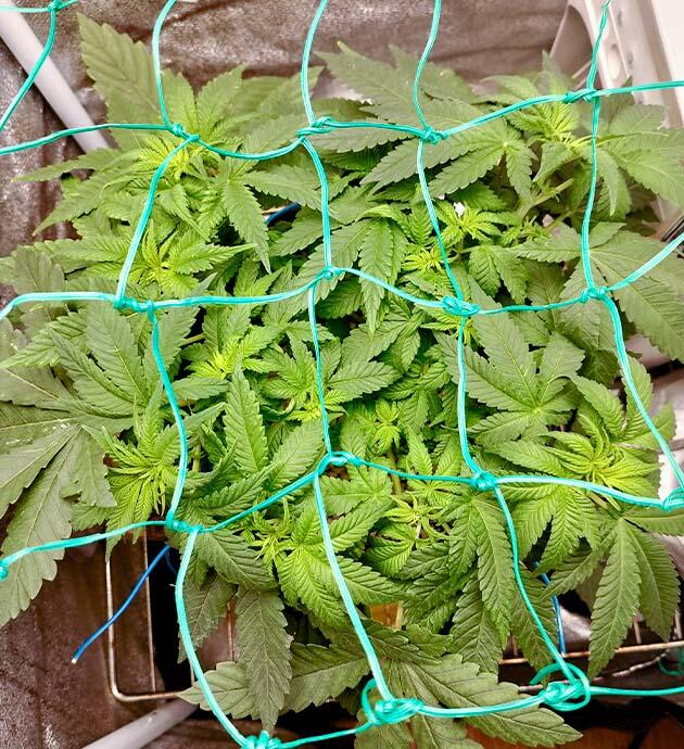 Кустик занял практически все места в сетке, но продолжает расти, а я продолжаю его бережно заплетать. Сейчас появился уже довольно сильный запах классической марихуаны, который ни с чем не спутаешь. Стараюсь поливать с открытой дверцей быстрее, чтобы не привлекать внимание кота или, не дай бог, соседей. Поэтому без фильтра поднимать этот сорт не рекомендую точно.