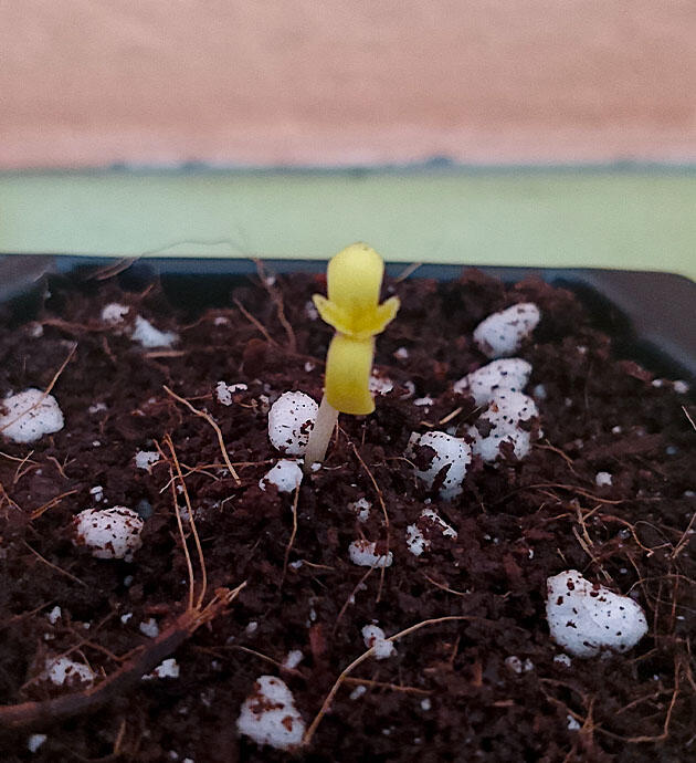 Первые 5 дней росток был в контейнере от микрозелени, чтобы не проливать до дренажа весь пятилитровый мешок. И вдобавок если сразу сажать в горшок, то саженец будет тянуться, и насыпать ему холмы ну как-то не айс.