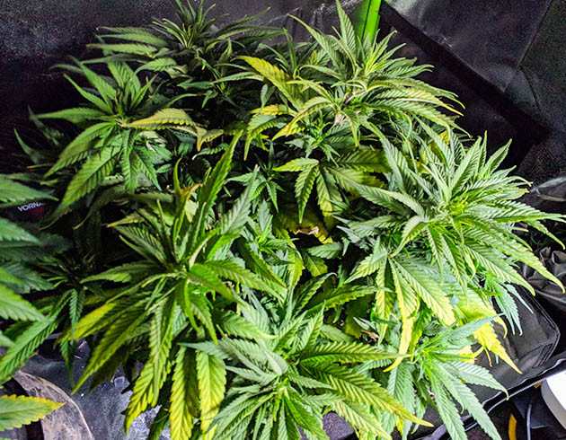 После перевода в цветение растихи получили подкормку из G.O. Thrive Grow, CaMg+ и G.O. Bud (1,32/0,66/1,25 мл/л). На кустах было достаточно много желтых и больных листов, преимущественно в нижних частях растений. Я обрезал их вместе с небольшими веточками. В целом девочки после дефолиации выглядят нормально, будто полностью оклемались от проблем.