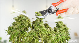Давайте поговорим о техниках тренировок. Я планирую использовать FIM-обрезку и LST-подгиб. LST займемся чуть позже, а пока возьмёмся за острое и выполним обрезку пятого узла роста. Что получилось, вы можете увидеть на фото. На следующий день в месте среза уже наметился рост, что меня удивило, такой живучести я еще не наблюдал.
