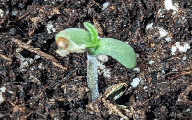 Выбрал самое крупное из трех семян, положил на ночь в рюмку с бутилированной водой плюс десять капель перекиси водорода. Поставил рюмку в теплое темное место. На следующее утро помог семечке утонуть и поместил между ватными дисками в пищевой контейнер. Выдохнул в контейнер CO2, обернул полотенцем и положил в темноту на обогревающий мат для рассады. Уже через сутки показался корешок длиной около 10 мм, что меня обрадовало. Опираясь на мой опыт, это говорило о том, что семка очень жизнеспособная.
