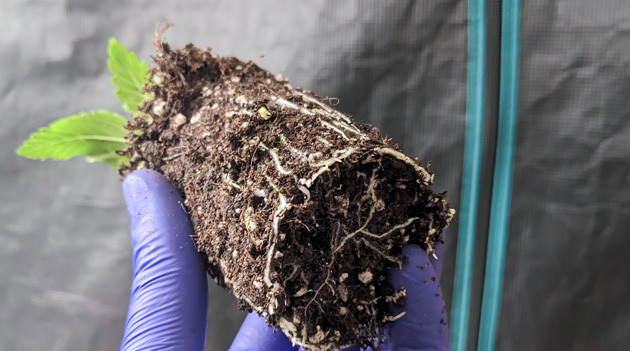 Аккуратно корешком вниз высадил ее в пластиковый стакан объемом 0,5 л, грунт использовал Biobizz Light Mix, немного смочив его из пульвика. Сверху места высадки поставил пластиковый стаканчик с отверстиями на дне для вентиляции. Внутрь него также прыснул из пульверизатора.
