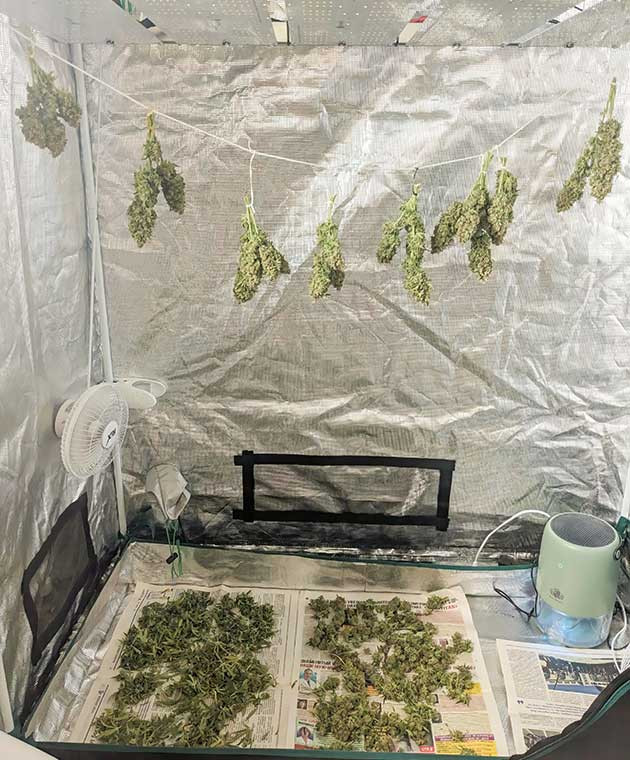 Просушку осуществлял в этом же гроутенте. За окном шли ливни, поэтому срок сушки составил восемь дней. Пришлось даже подключить осушитель. Бережно разложил на газете все то, что нельзя подвесить, остальное развесил на одной нитке.