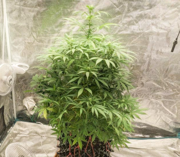 Перешел на «диету» в 50 % от значений, рекомендуемых производителем удобрений. На внешнем виде растения это никак не сказывается в худшую сторону. Выглядит отлично. Раз в 3 дня заливаю 4 литра компота. Цветение протекает комфортно, без стрессов и проблем. Шишки стали покрываться трихомами и издавать уже более характерный запах. Некоторые листы желтеют и вянут, их я периодически состригаю. Также состригаю часть зеленой листвы. Вообще, конкретно этот сорт мне запомнился повышенным количеством листвы. Предвижу, что тримминг будет не из легких.