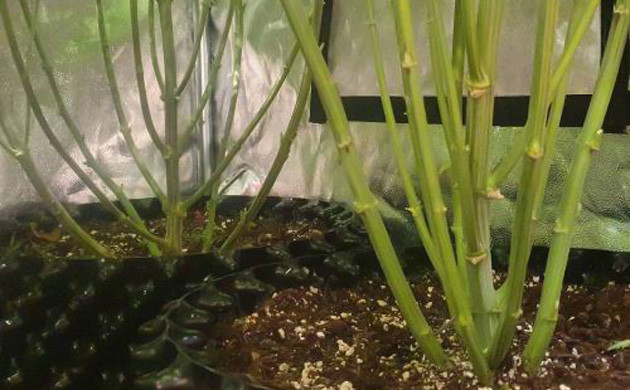 Две следующие недели я кормил растихи по прежней схеме. Кусты вытянулись еще немного, и вертикальный рост прекратился полностью. Как только растихи перестали вытягиваться, я начал постепенно удалять листву с кустов. Начал с нижней части, не отрезая много, по паре с куста за раз.