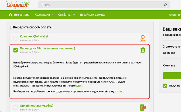 Процесс оплаты биткоинами заключается в переводе btc с кошелька на кошелек. Выбирая оплату биткоинами на «Семяныче», вы получаете наш кошелек, на который необходимо перевести указанную сумму в btc. После этого ваша транзакция должна быть подтверждена в сети биткоин, что не требует от вас никаких действий. Спустя некоторое время ваш платеж получит подтверждение и будет считаться совершенным.