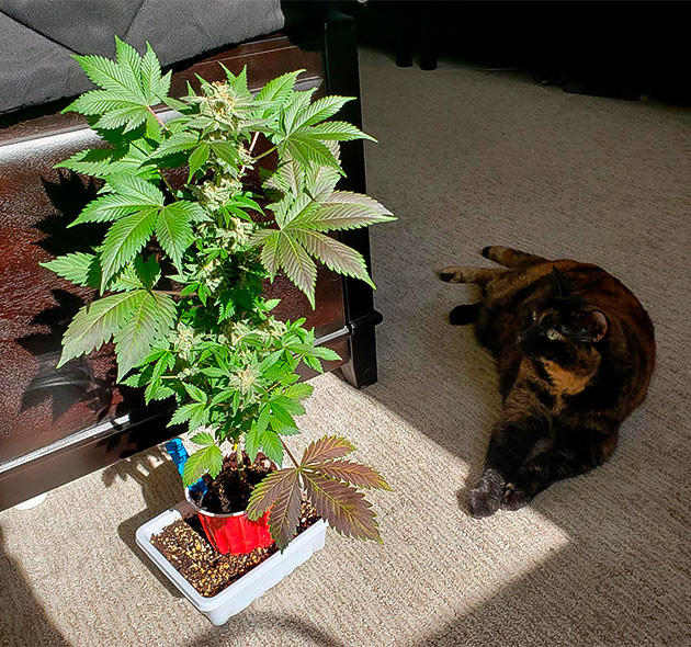 А вот этот небольшой автоцветущий кустик мне удалось вырастить и вовсе на подоконнике с естественным освещением. Дополнительно я использовал небольшой контейнер с почвой, чтобы придать растению устойчивость и обеспечить доступ к влаге в жаркие периоды. Дно пришлось вырезать, чтобы корни могли немного расправиться, так что я не уверен, что подобный гров можно назвать участником челленджа, но мне нужен был предлог, чтобы выложить фотографию моей любимой кошки.