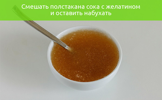 1. В миске смешайте полстакана сока с желатином и отставьте в сторону, пока желатин не разбухнет.