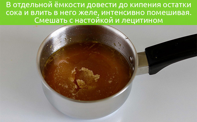 4. В отдельной емкости доведите до кипения остатки сока и влейте в него желе, интенсивно перемешивая. Когда желатин полностью растворится, плиту можно выключить, а само желе смешать с настойкой и лецитином, продолжая взбивать.