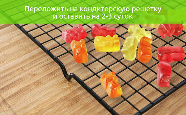 8. Для сушки желешки раскладываются на кондитерской решетке и оставляются при комнатной температуре на 2-3 суток. Когда поверхность мишек станет плотной, их можно перекладывать в герметичный контейнер. При комнатной температуре они будут храниться около 12-15 месяцев, но если этап сушки вы решили пропустить, то хранить такие лакомства все же лучше в холодильнике и не дольше 2 недель.