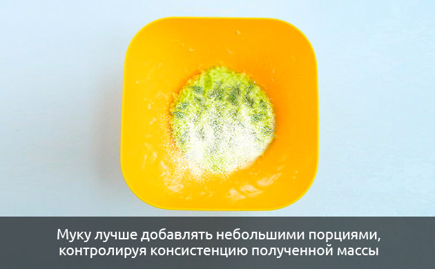4. Мелко нарежьте зелень (петрушку, укроп или другую на ваш вкус) и добавьте к общей массе. Туда же всыпьте муку и положите предварительно растопленный в микроволновке или на плите канна-баттер.