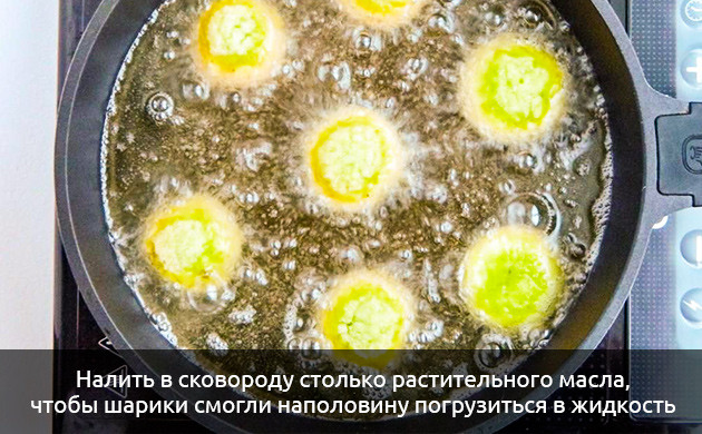 7. Возьмите сковородку и налейте в нее такое количество растительного масла, чтобы шарики смогли наполовину погрузиться в жидкость. Разогрейте масло и переключите на средний огонь.