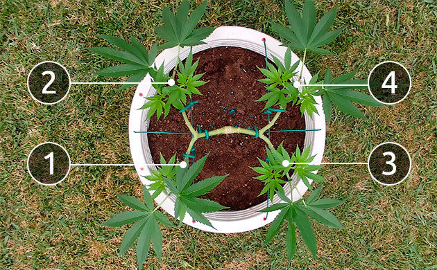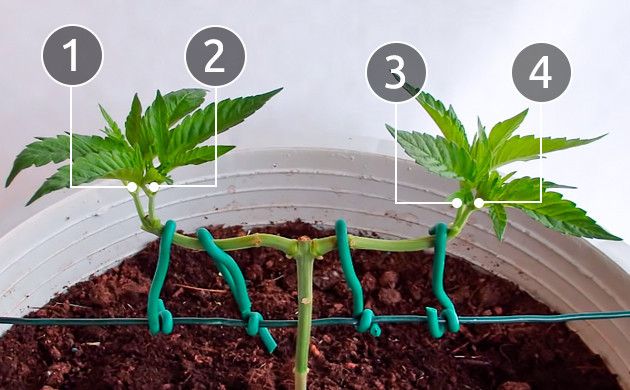 • Из оставленного узла должны исходить два новых боковых стебля. Ваша задача будет зафиксировать их под углом 90° к центральной коле. Подгибать стебли нужно аккуратно и не спеша. Не все сорта каннабиса легко переносят тренировки, какие-то ветви более хрупкие и попросту не перенесут резких движений. Даже если в процессе подгиба стебель надломился, зафиксируйте его в нужном положении, используя скотч или шнурок. Со временем он может прирасти обратно. Чтобы зафиксировать побеги, лучше использовать нетравматичный материал. Это должна быть достаточно толстая проволока в оплетке. Слишком тонкие нитки, лески или проволока могут передавить побег и препятствовать поступлению питательных веществ.