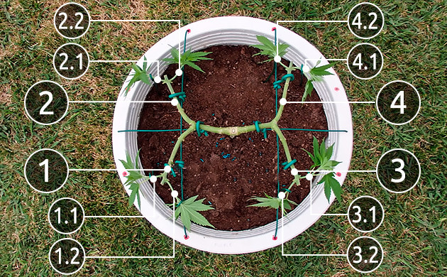• Снова даем кусту время на выздоровление и далее повторяем аналогичные операции до тех пор, пока на нем не сформируется желаемое количество кол. Каждый раз «топая» верхушки, вы удваиваете количество побегов. Кто-то предпочитает остановиться на 16, кто-то на 32 или даже 64. Тут дело в личных предпочтениях и доступном пространстве для роста. Для многих случаев вполне хватит 8-16 кол, большее их количество не даст увеличения урожая.