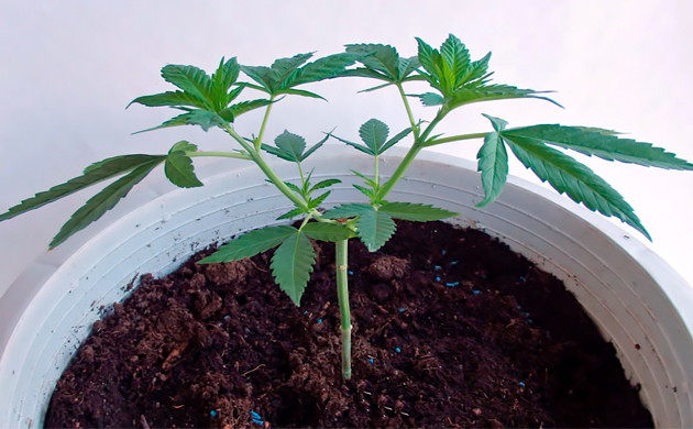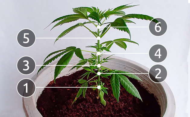 • После прорастания семян дождитесь, пока куст сформирует 5-6 узлов. Некоторые гроверы начинают растягивать коноплю чуть ли не с первых листьев, но на тот момент у нее еще нет достаточно сил и зеленой массы, чтобы быстро оправиться. Затягивать с началом тренировки тоже не стоит, ведь следующим этапом в любом случае будет обрезка. Работать лучше с молодым, но достаточно окрепшим растением. Ни в коем случае нельзя выполнять мейн лининг на цветущем кусте конопли.