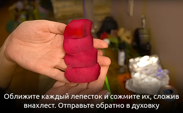 6. Поместите лепестки в заранее разогретую духовку буквально на 10-15 секунд. Этого времени обычно хватает, чтобы листочки немного подвяли, стали более гибкими и из них ушла лишняя влага. Мы специально не указываем температуру нагрева, так как все духовки разные и режимы у них разные. Просто последите за состоянием лепестков через дверцу и вытаскивайте, когда они немного обмякнут, а их цвет станет более темным.