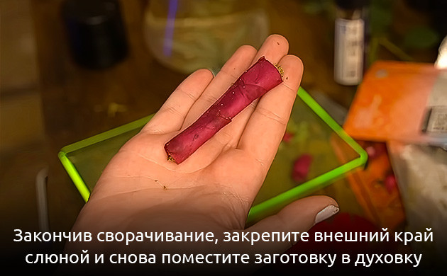 9. Вынув из духовки, вы получите розовую заготовку, которую сразу же нужно будет заполнить и свернуть. Тут уже процесс практически ничем не отличается от сворачивания обычной самокрутки. Единственное различие – работать нужно немного аккуратнее, чтобы не порвать хрупкие листочки.