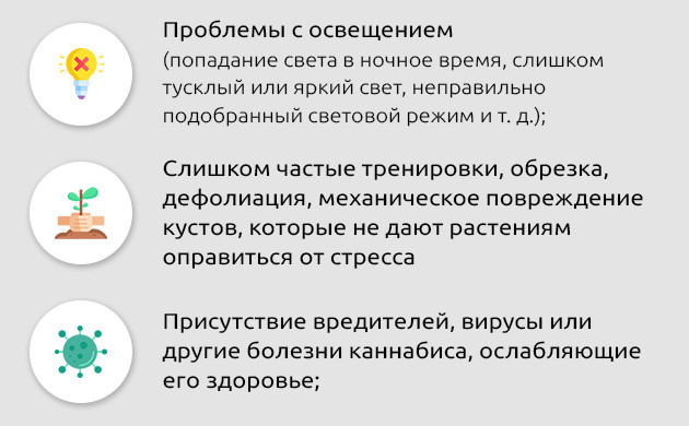 - присутствие вредителей, вирусы или другие болезни каннабиса, ослабляющие его здоровье;