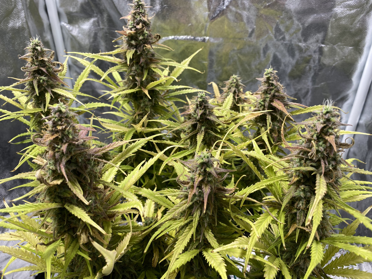 дополняю свой отзыв, сорт выращивать просто сказка, никаких проблем, шишки под харв становятся красивые лиловые. Если со светом все норм у вас , куст не вытянется, будет приземистым и коренастым, от каски до харва ровно 60 дней , трихомы замутнели зарубил .. с куста в восьмилитровке земли сухого вышло 65г