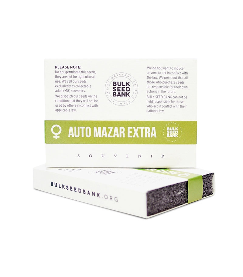 Сорт конопли Auto Mazar Extra является одним из самых высоких и продуктивных автоцветущих разновидностей Bulk Seed Bank. Гибрид на 100% стабилен и феминизирован, а по своей действенной силе, вкусу и аромату напоминает оригинальный сорт. Чтобы добиться таких показателей, селекционерам пришлось вывести два поколения переходных разновидностей, последняя из которых была скрещена со специально отобранным рудералисом.