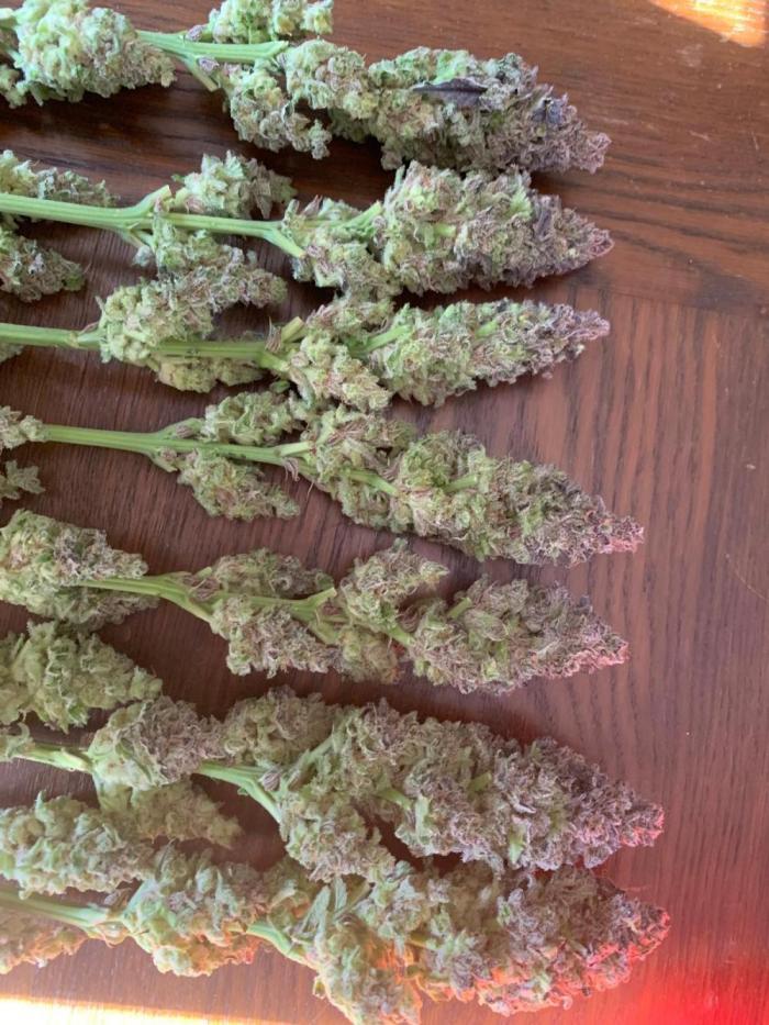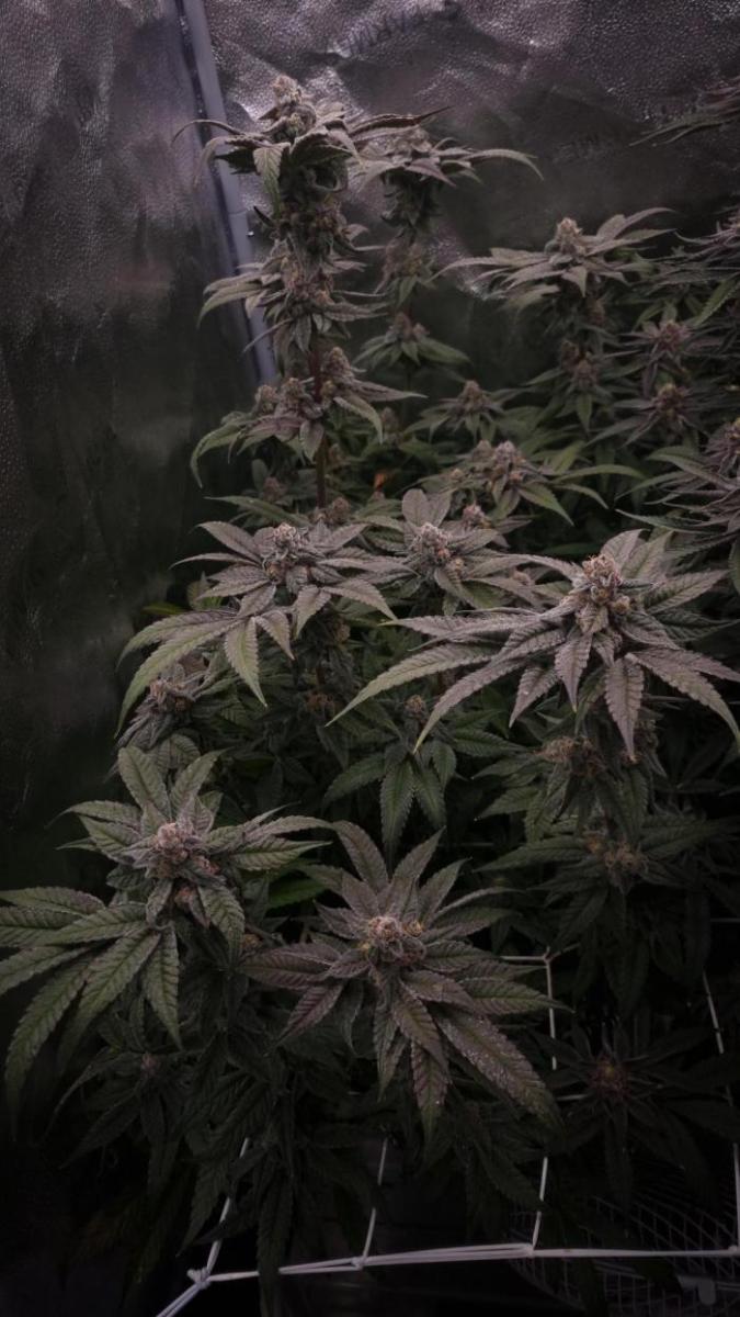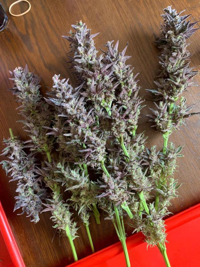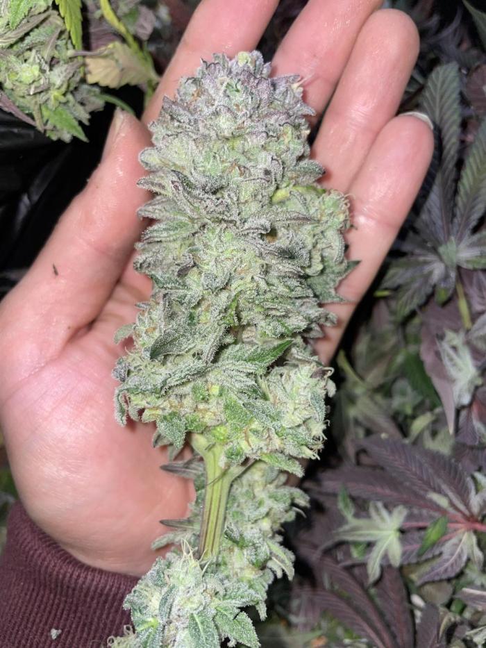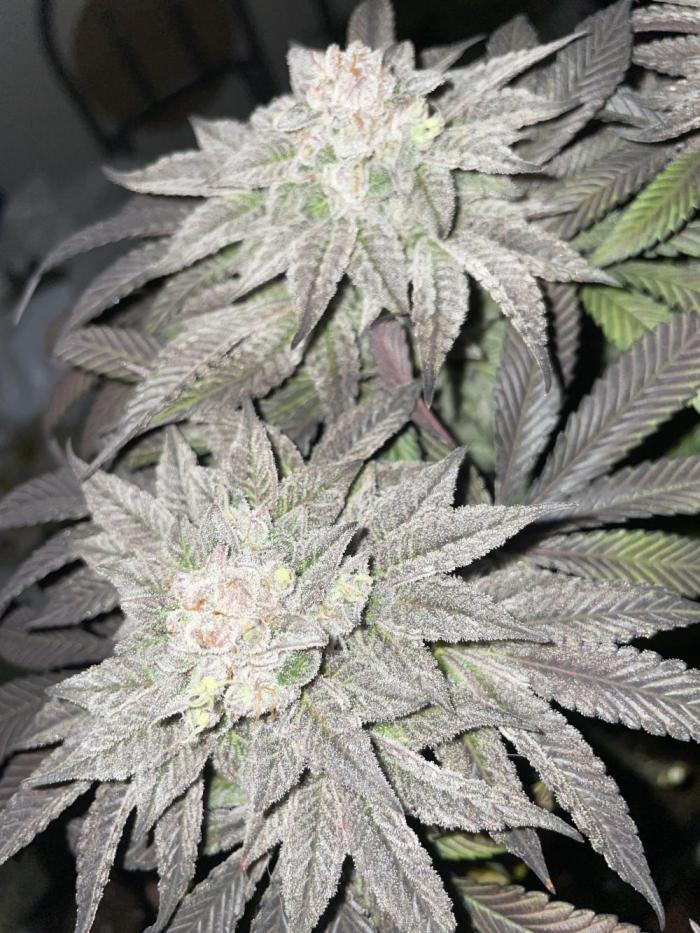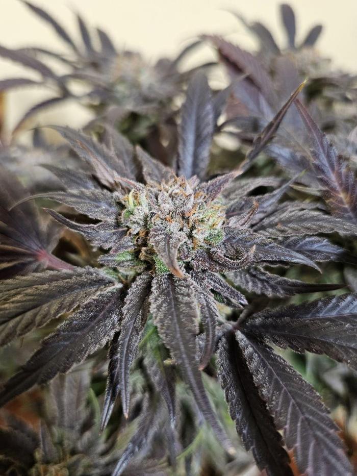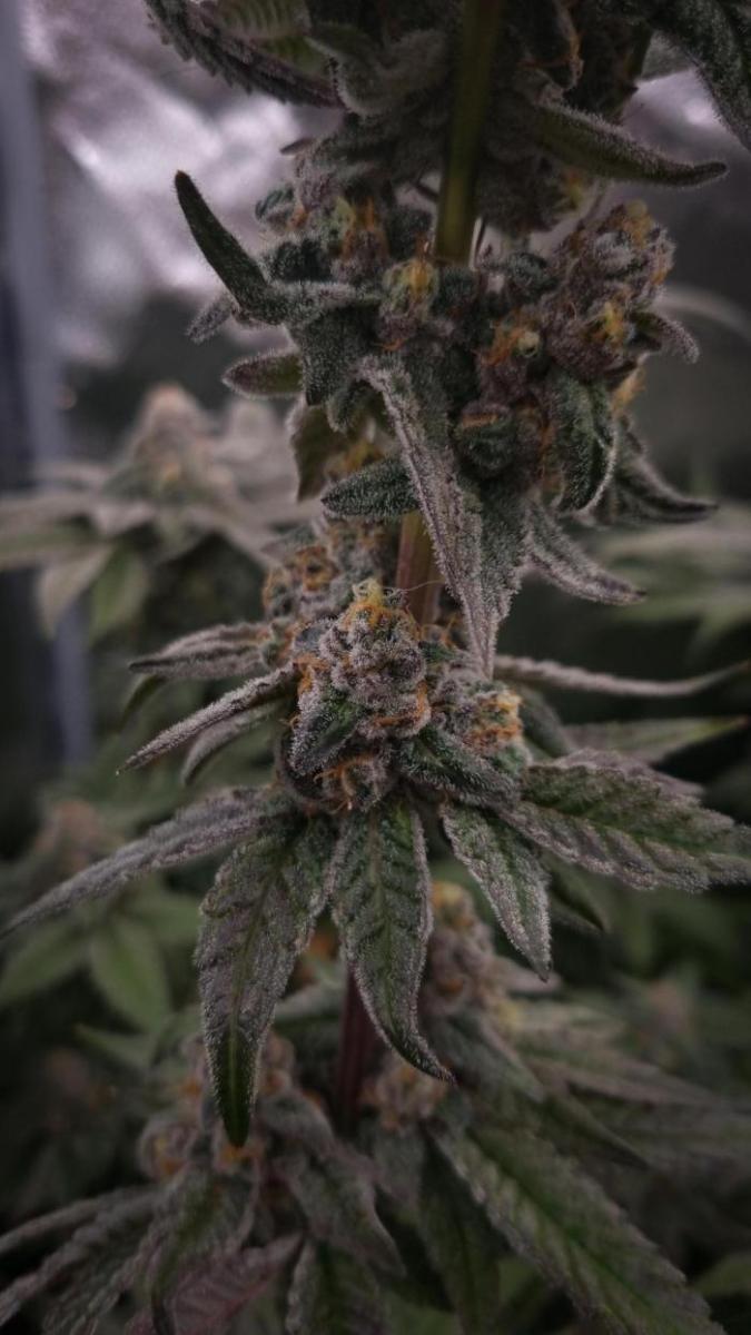 Покрытие трихомами было эпическим, и некоторые веерные листья были почти полностью ими покрыты, чего раньше никогда не случалось. Шишки среднего размера и твердые как камень. В последние дни перед харвестом у растения словно немного выцвел темно-фиолетовый цвет. Запах был землистым, древесным и кушевым.