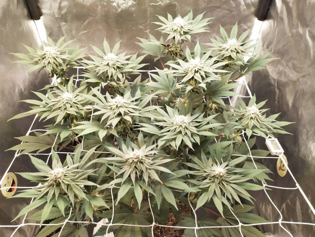 В 6 недель кустики уже окончательно оправились от стресса и обросли новыми побегами и листвой, да и в высоту уже были по 40 см, так что были переведены на цветение. Зацвели, кстати, вообще без проблем, очень быстро. На цвете активное наращивание зеленой массы продолжилось, но к 11 неделе прекратилось. Шишки пухли на глазах, листва приобретала умопомрачительные оттенки.
