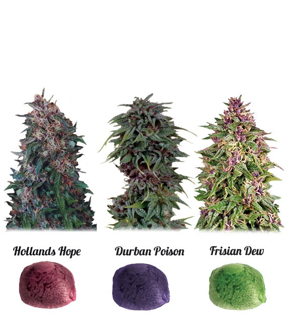 Феминизированные семена конопли Colour Mix 2 содержат микс из трех сортов идеальных для аута. Holland Hope, Durban Poison и Frisian Dew. Их объединяет короткий период цветения 53-60 дней и богатый урожай. По желанию их можно выращивать в индоре, но именно на открытом грунте они покажут высший класс.