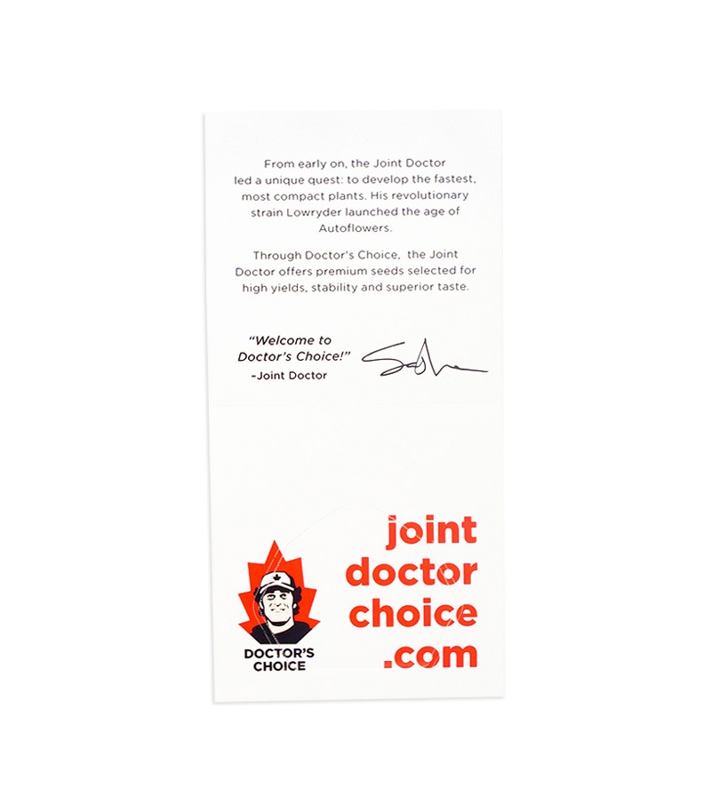 Выведением сорта каннабиса Doctor’s Choice #1 auto fem занимался лично владелец всемирно известного сидбанка Joint Doctor. Он получился настолько удачным и уникальным, что на его основе было решено создать совершенно новый семенной бренд.