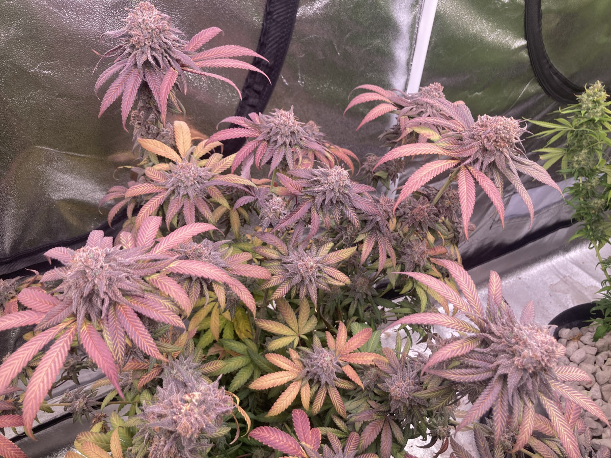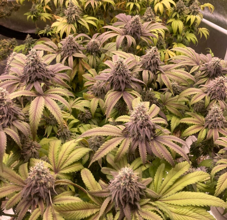 Было 3 растения, но только одно оказалась ну прям самым фиолетовым. Хотя все получились отличными. Растихи пребывали на вегетации всего 4 недели, так что во время следующего грова подержу на веге подольше, недель до 8, чтоб кусты больше массы нарастили. Шишки получаются очень плотными, толстыми и липкими. Вообще гров простой и забавный, кусты этой генетики очень послушные и предсказуемые, но в плане эффекта шишки способны на многое, так что скучно не будет.