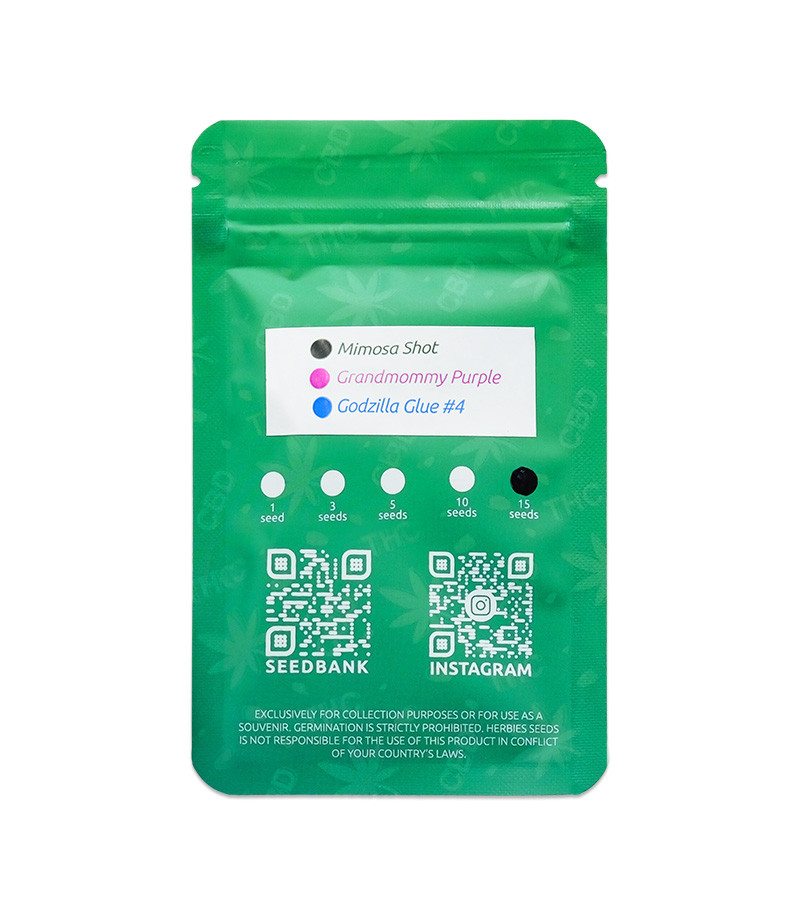 Сидбанк Herbies Seeds собрал свои самые мощные сорта и объединил их в микс под названием Heavy Kickers Mix. В эту коллекцию семян вошли растения Mimosa Shot, Grandmommy Purple и Godzilla Original Glue GG#4. Содержание ТГК в созревших соцветиях этих сортов варьируется от 27 до 33%. Все три растения характеризуются генетической стабильностью, хорошей урожайностью, простотой в выращивании и первоклассным эффектом.