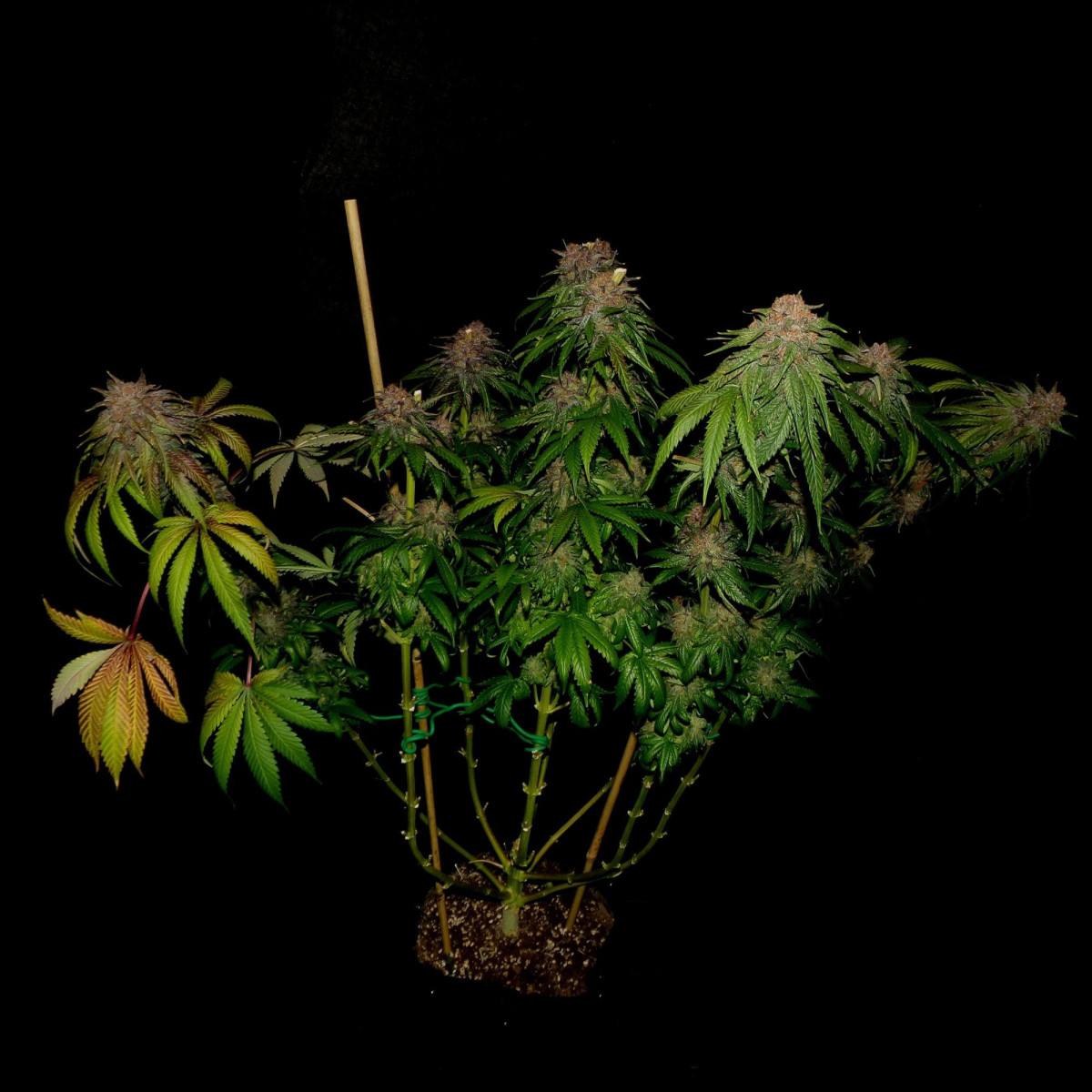 У этого сорта, у его шишек просто-таки удивительный запах. Действительно напоминает терпкий лимон с выраженными топливными нотками. Шишки плотные и смолистые. По структуре куст пышный, со средней длины колами. Только нижние ярусы не имеют длинные колы.