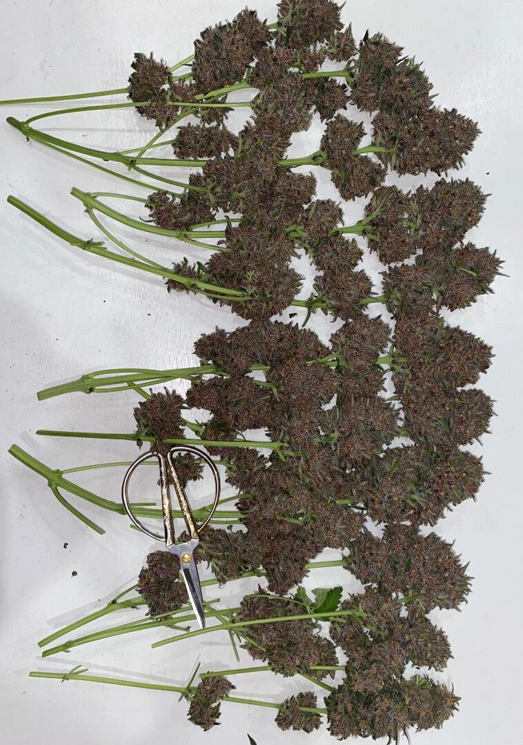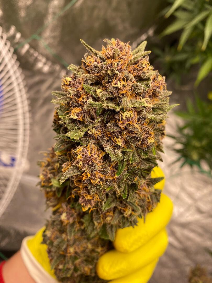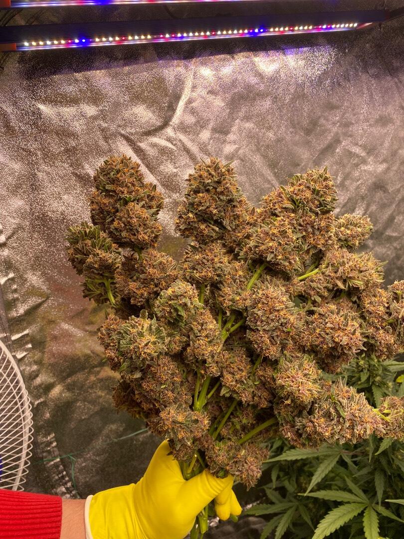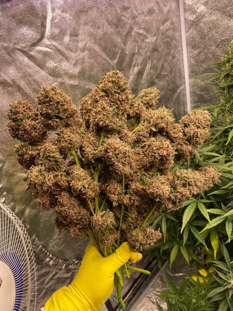 Это была ее последняя неделя, и теперь она готова. День 84 — ее последний день в палатке, теперь я помещаю ее на 72-часовой период темноты, а затем собираю урожай. Она пахнет так приятно и сладко. Бутоны толстые, но выглядят воздушными, после высыхания увидим. Во время последнего полива я положил немного льда на поверхность почвы, чтобы стимулировать появление большего количества трихом.