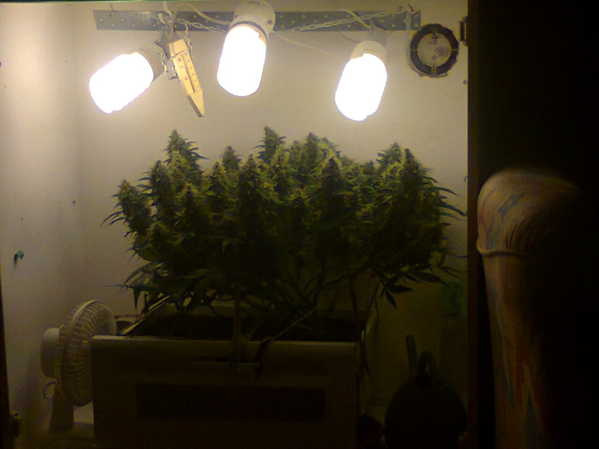 Вот и настал харвест на 70-ый день... Совсем некапризное растение. Через 50 дней отрезал центральную колу(знаю что нельзя на цвете но высота не позволяла),просушил эффект очень даже неплохой. Сначала первый месяц по глупости поливал минералкой (артезианской водой) из-за чего земля засолилась и растение все пожелтело-пришлось потом проливать корни чистой водой и пересаживать из 5ти в 10ти литровое ведро. Две пересадки,проливы и полное отсутствие вентиляторов(рос дома в комнате в шкафу с наполовину открытыми дверями). В общем и целом в 10ти литровом ведре под ДНАТ 400 у меня получился вот неплохой кустик:) Всем мир! Не бойтесь пробовать-Джа поможет! ;-)