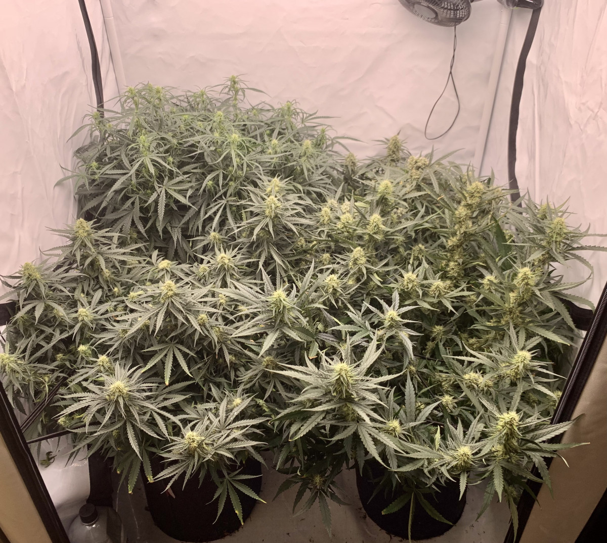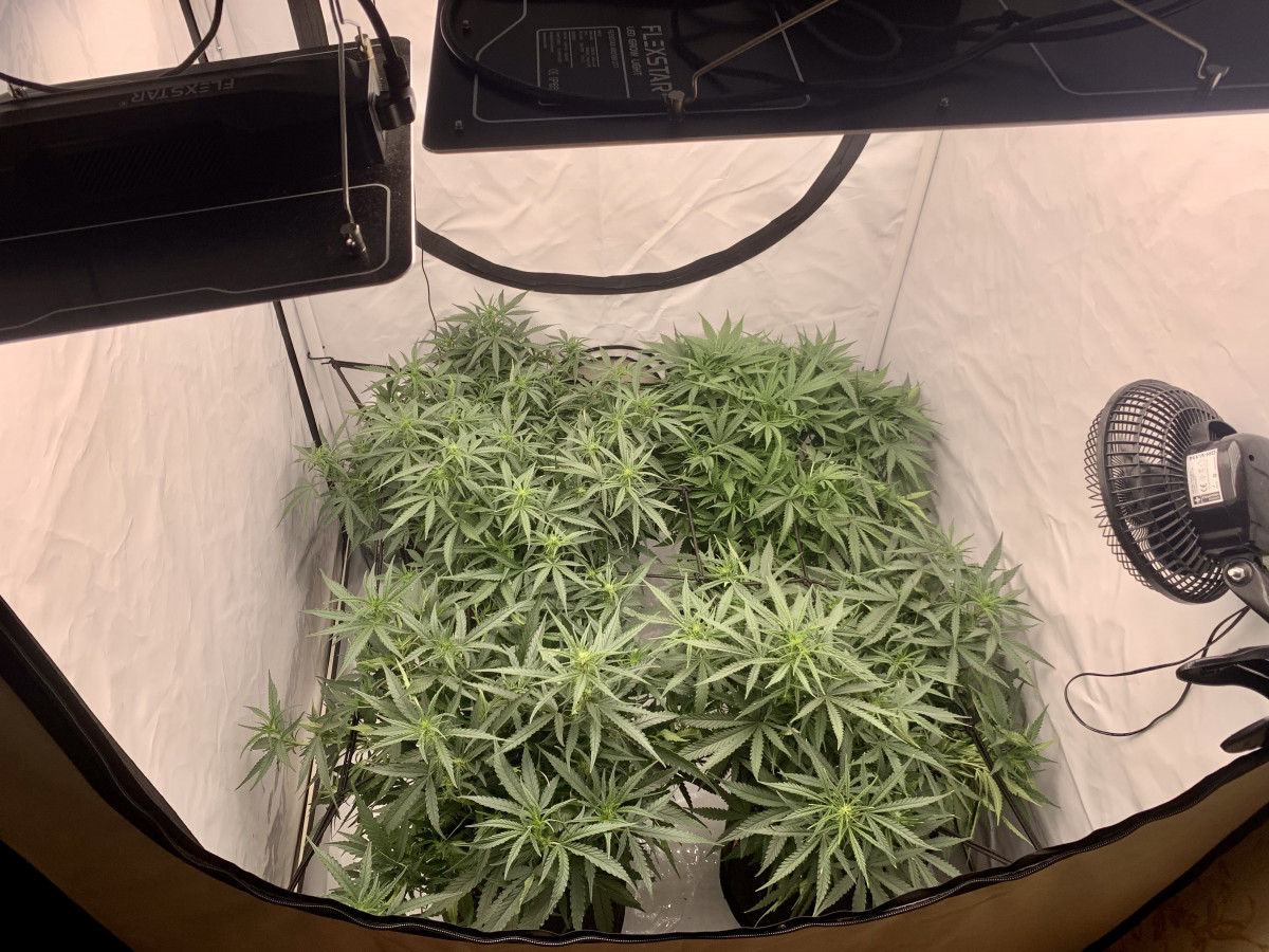 В горшках 20 л в кокосовом субстрате Plagron с перлитом жрут по 6 литров через день. Сегодня 42-ой день от каски, Plagron coco A и B + Pure Zim + Power Roots + Sugar Roal + Green Sensation, палатка 100*100*200 см, свет Sinowel 480 Вт + 120 Вт +120 Вт = 720 Вт