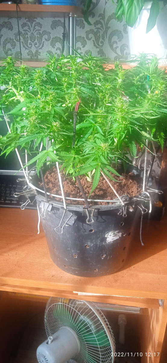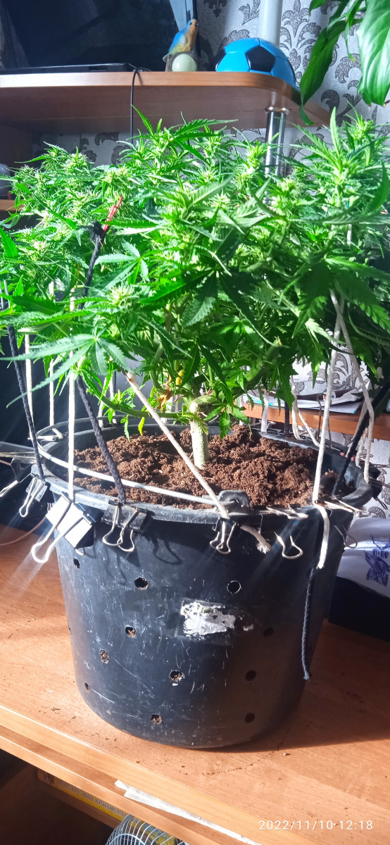 всем добра нам уже четыре недели условия остаются прежние запах усиливается стимуляторы и удобрения трёх компонентное сегодня пролил гуматом калия продолжаю тренировки был надлом центрального стебля но при этом стресса не было даже не повяла ни сколько температура в боксе тридцать пять влажность пятьдесят процентов уже начался предцвет всём желаю успехов