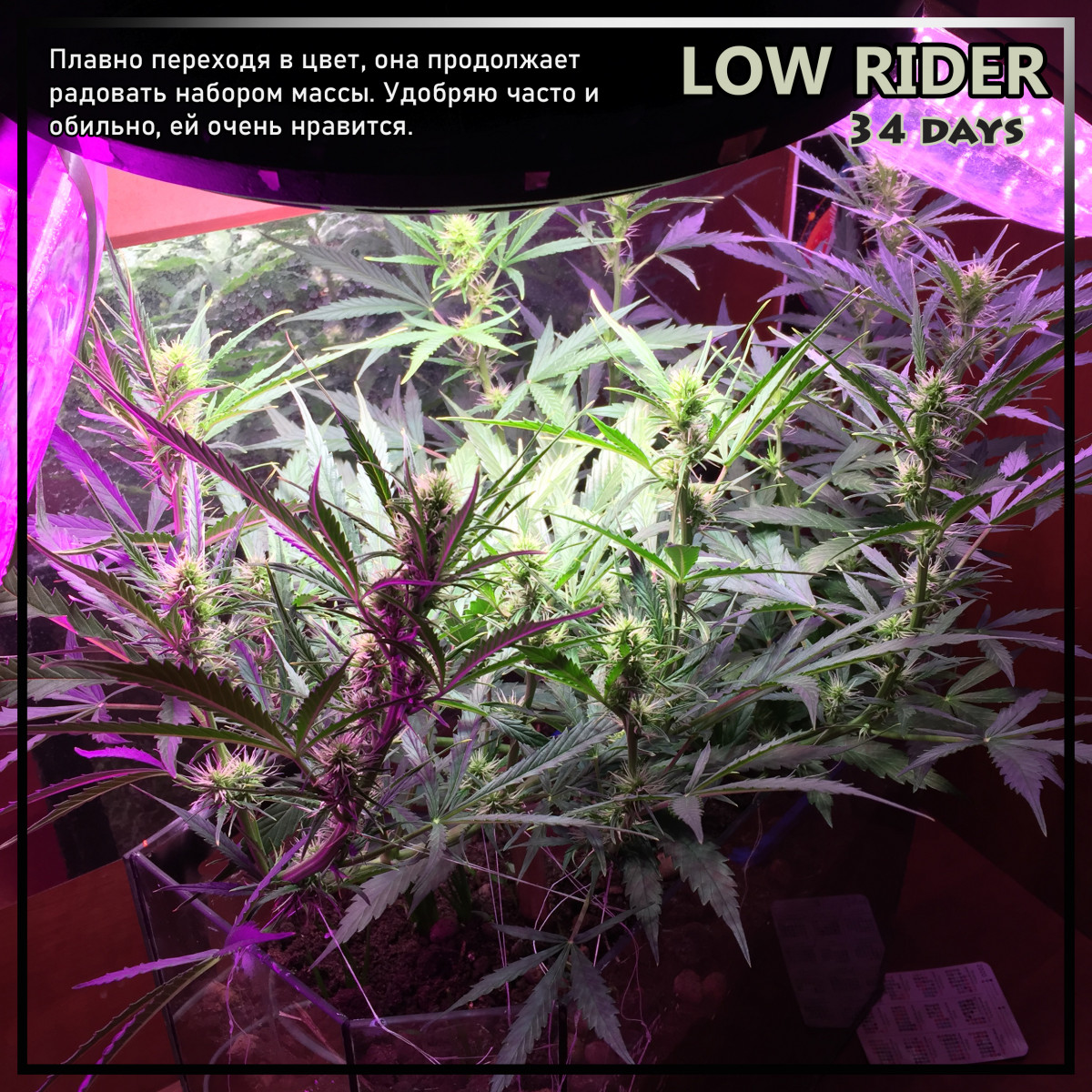 - Общие впечатленияПолевые заметки вы можете наблюдать на фото ниже. Выросла девушка как по паспорту, ей потребовалось ровно 60 дней. В принципе подержать ещё было можно, но мне хотелось сохранить в ней больше сативной лёгкости. Лампы LED 100 Вт если сложить все 3 штуки, каждая светит в своём спектре. Удобрял на всех стадиях обычной органикой для цветов за 110р из садового магазина. Поливал чистой артезианской водой примерно по 1л воды через 2 дня в течении месяца, и раз в 2-3 дня по 1,5л по 2л по настроению. В сумме у меня получилось собрать с 1 куста около 60 - 70г вкусных.